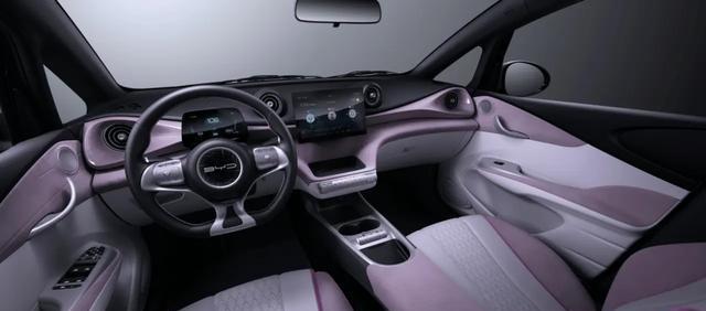 内饰简洁规整,中控台采用拼色设计,配备5英寸液晶仪表与12.8英寸中控屏,搭载DiLink系统提升科技感。圆形出风口、可爱三幅方向盘及拨杆换挡,营造温馨驾驶氛围。