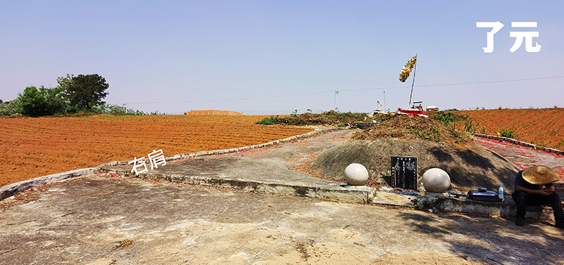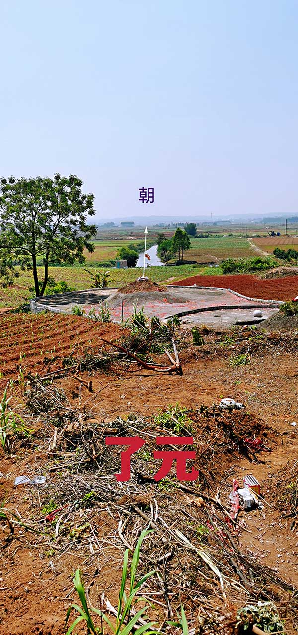 红点处即为穴场(黎氏族坟),坟后三十几米即是穴星,是为土坡起顶垂乳开大坪结穴,左右自身高起大窝砂,砂手环抱有情,尤其左下砂较高收水甚力。来龙悠远,于现场看,龙身(土坡)起伏较大,但拍摄不出效果,来龙大开帐幔,土坡较为肥硕,故此龙气旺盛而厚重。