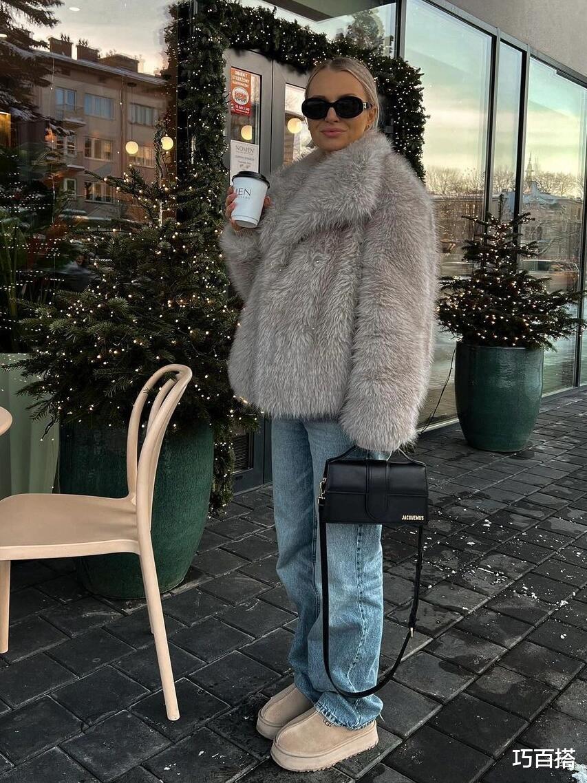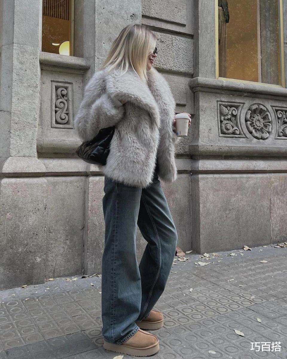牛仔裤与雪地靴的组合,并不是一蹴而就的,很多时候,它们也需要依靠其他单品进行修饰,比如,大家可以选择博主身上这类貂皮外套。