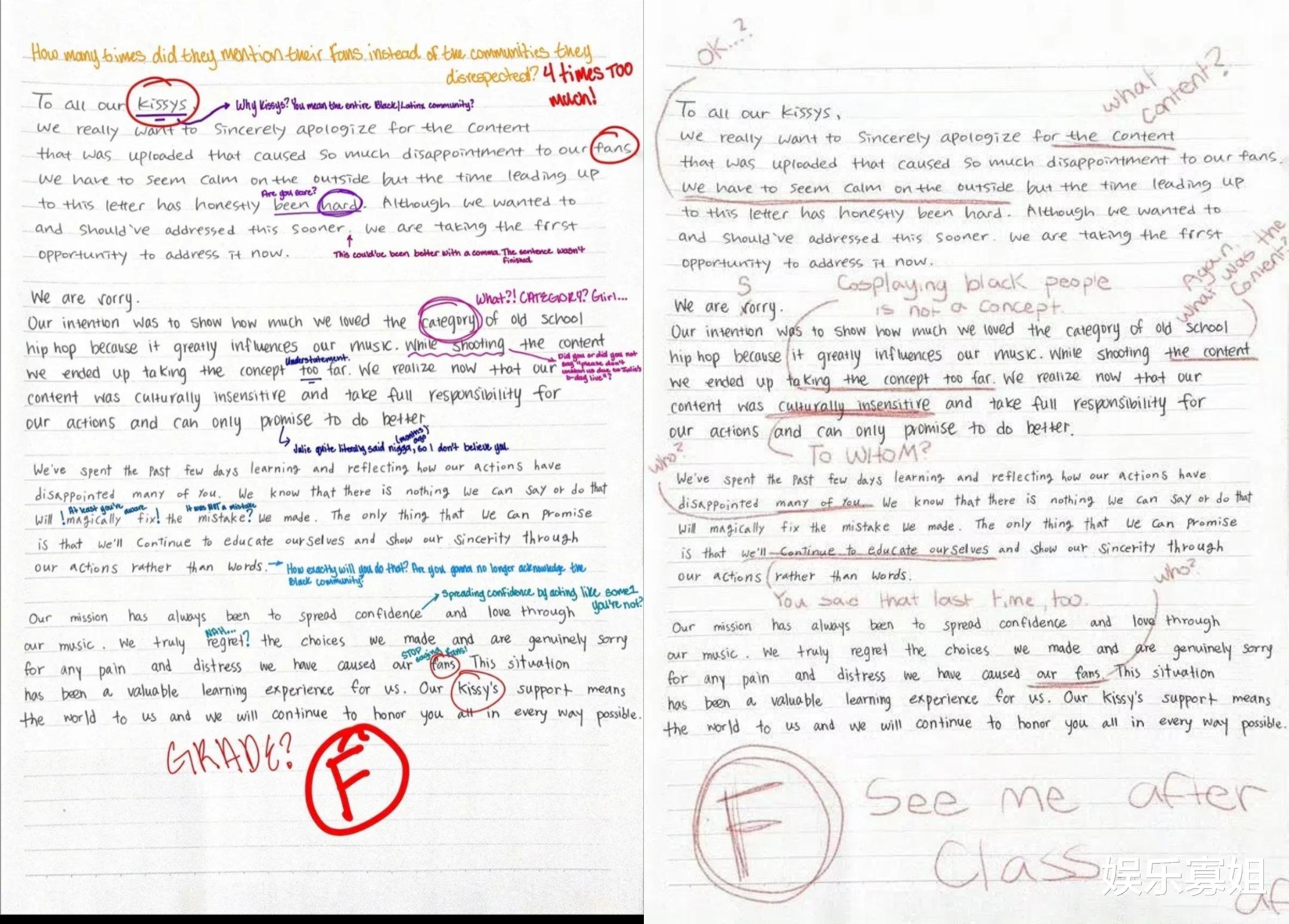 对此,公司迅速删除视频,让成员们道歉并+手写道歉信,结果道歉信不够真诚,让外网网友更愤怒,又一次审判kissoflife,还批上了道歉信。妹妹们应该是无心之举,没想到她们这样做会伤害到黑人,以后还是要谨言慎行、注意言辞,毕竟作为公众人物,一举一动都受到关注。