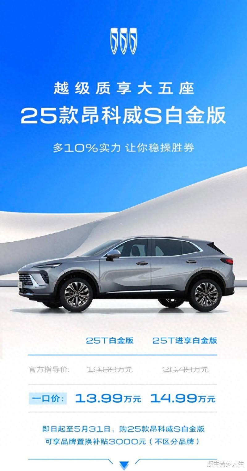 价格优势:性价比之王昂科威S白金版的售价区间为13.99万元至14.99万元,相比竞品具备明显的价格优势。同时,购车期间(2025年3月18日-5月31日)还提供置换补贴政策,最高可享受3000元补贴,并可叠加国家及地方补贴。这样的优惠政策无疑降低了消费者的购车门槛。
