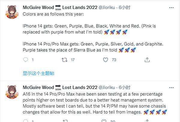 Jioriku爆料显示在配色方面iPhone14标准版的配色为绿色、紫色、蓝色、黑色、白色、红色,取消粉色版本,iPhone 14 Pro配色为:绿色、紫色、银色、金色、石墨色,取消远峰蓝。