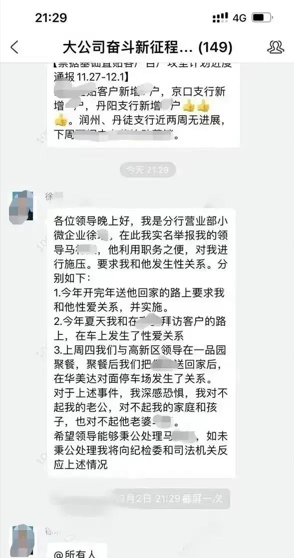 据了解,这位银行职员在工作期间遭受到了上级领导的非礼行为,尽管她曾在工作群中匿名进行过提醒,但那位领导仍然对她施加压力,要求与她保持亲密关系。这样的情况持续了三次次,这三次都是在车上。在这样的情况下,该女士选择在第三次事件发生后进行实名举报,从一方面讲,这是对她自身尊严的维护;而在另一方面,这也是对于社会公义的呼唤。