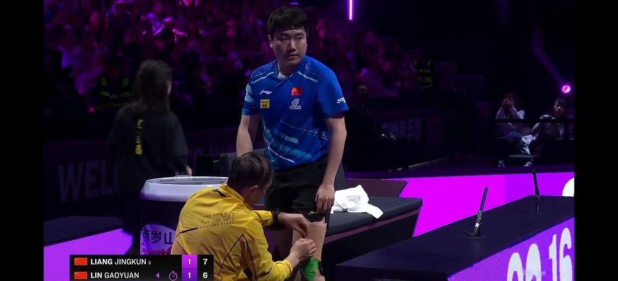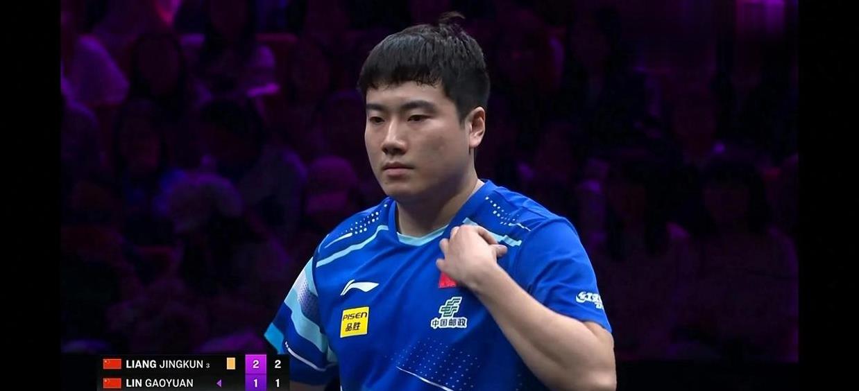 关键时刻江陵路10:9率先拿到局点,林高远挽救一个局点后梁靖崑又先后拿到四个局点,最终15:13险胜先下一局。第二局林高远突然发力,开局双方3:3平后连拿5分,8:3领先后梁靖崑追回一分,9:4后11:4速胜拿到一局。第三局开局林高远3:1领先,结果被梁靖崑追到4:4平后7:6反超比分。林高远叫了暂停,暂停时梁靖崑趁机让队医进行治疗,因为时间过长回来被裁判出示了黄牌。暂停回来后去双方战至9:9平后梁靖崑抓住机会,11:9再下一局。第四局林诗栋1:3落后,随后双方战至5:5平后梁靖崑连续拿分,11:7结束比赛!不得不说,梁靖崑虽然腿上有伤,但是比赛中的求胜心实在是特别强。