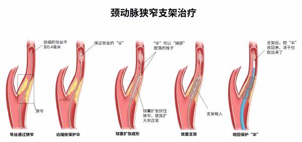 颈动脉支架成形术(CAS):即在颈部血管放支架,利用支架把狭窄的血管管腔给撑起来,与心脏冠状动脉放支架是一个道理。