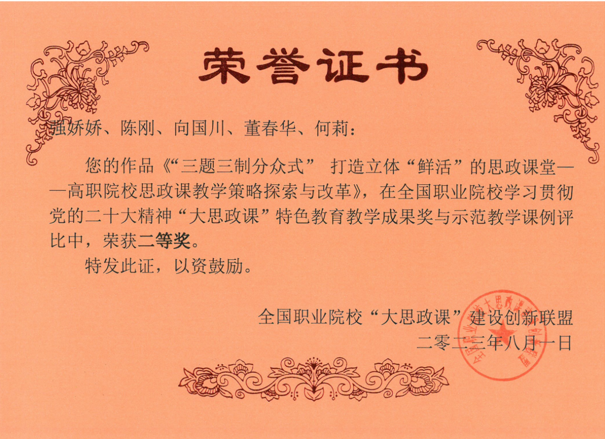 日前,全国职业院校“大思政课”建设创新联盟发布了全国职业院校学习贯彻党的二十大精神“大思政课”特色教育教学成果奖与示范教学课例评审结果的公示,共评选出一等奖6名、二等奖14名、三等奖20名、优秀奖24名。四川信息职业技术学院马克思主义学院教师强娇娇团队的作品《“三题三制分众式”打造立体“鲜活”的思政课堂——高职院校思政课教学策略探索与改革》荣获二等奖,为四川省职业院校中最佳成绩。
