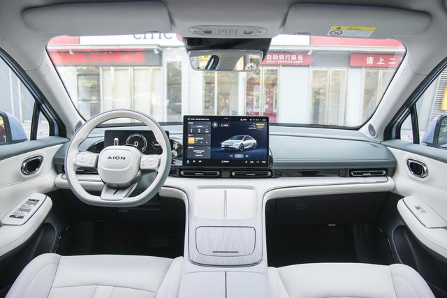 进入车内,新车的中控台整体呈现出“T”字形布局,传统的挡把操控台面被抬高,上方配有倾斜的手机无线充电面板,方便了前排乘客拿取。其周圈被木纹饰板所覆盖,车内大面积的软质包裹,在内饰的颜色上,AION S MAX还提供了星夜黑和皓月白两种配色,在这里小编尤其推荐白色内饰,虽说脏了打理起来比较费事,但是对车内质感的提升还是相当明显的。该车中控区简化了大量的实体按键,车速、电量等信息通过10.25英寸的液晶仪表来显示,14.6英寸的悬浮式中控屏则是集成了多媒体、导航、语音连续识别以及空调控制等功能。