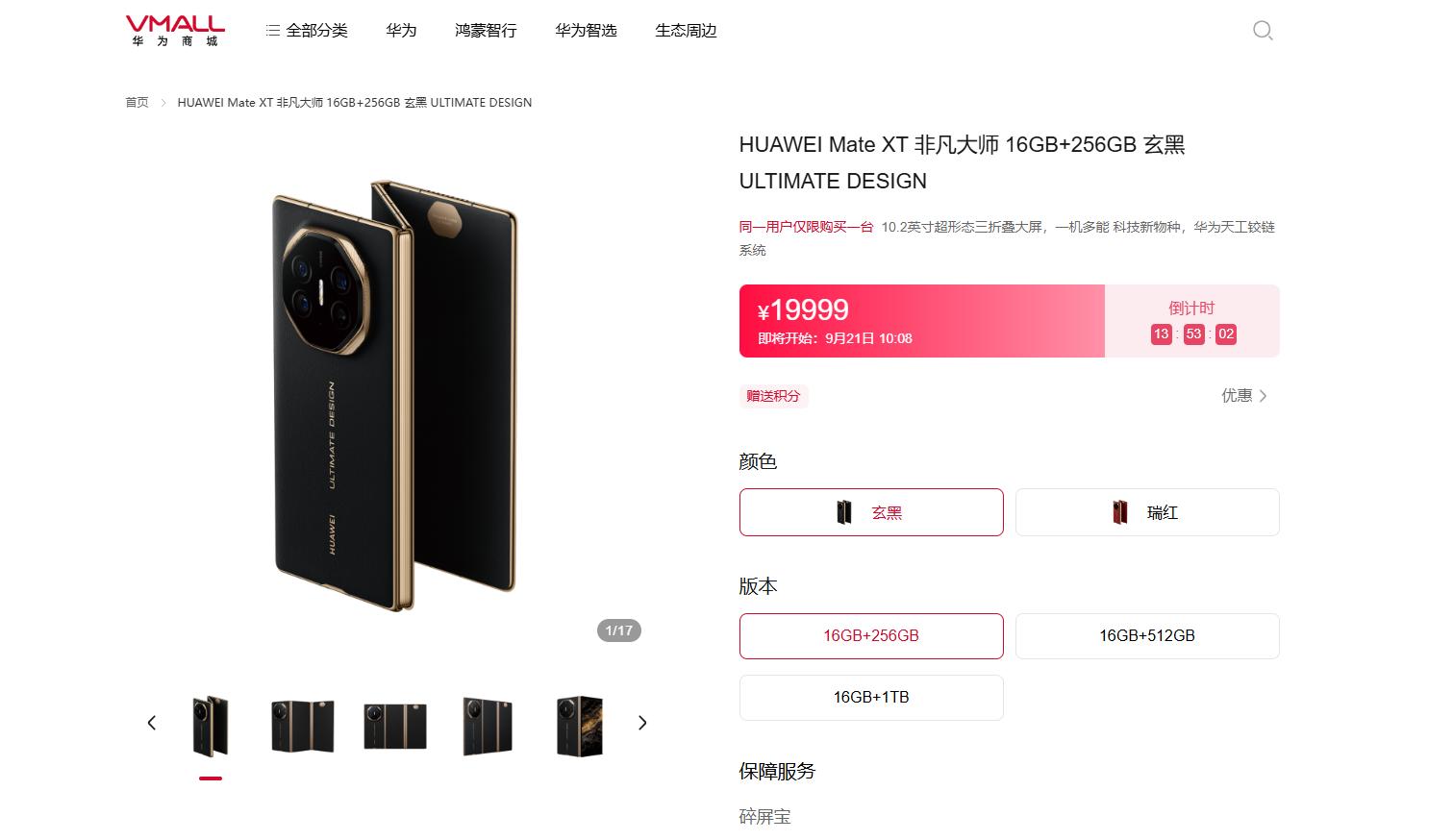 华为Mate XT提供三种配置,满足不同的存储需求:16GB+256GB存储,售价19999元16GB+512GB存储,售价21999元16GB+1TB存储,售价23999元