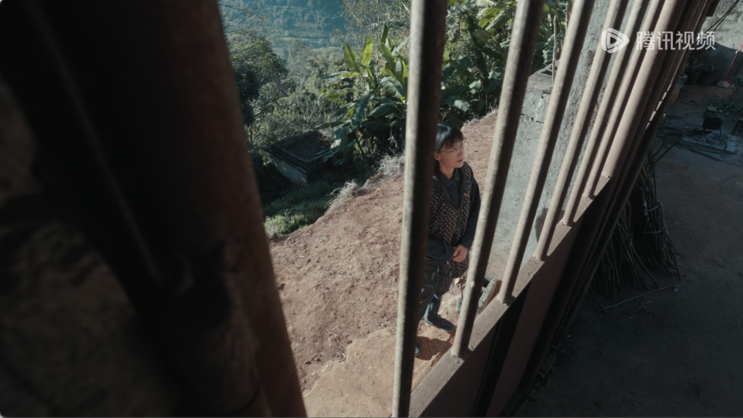 她们被反复的灌输着性别歧视的思想,女孩就“应该”被卖出去换钱,就“应该”不停地生孩子,就“应该”放弃上学的权利。这逐渐成为了她们自己的思想,从外部禁锢变成了自我束缚。疯女孩一直游荡在村子里,已经成为了村子的一个“景观”,她是这个地方性别歧视下的悲剧。当张桂梅去到谷雨家的时候,却反复地被挡在门外。在俯拍的构图中显得格外渺小,并被门上的栏杆所切割、阻挡。