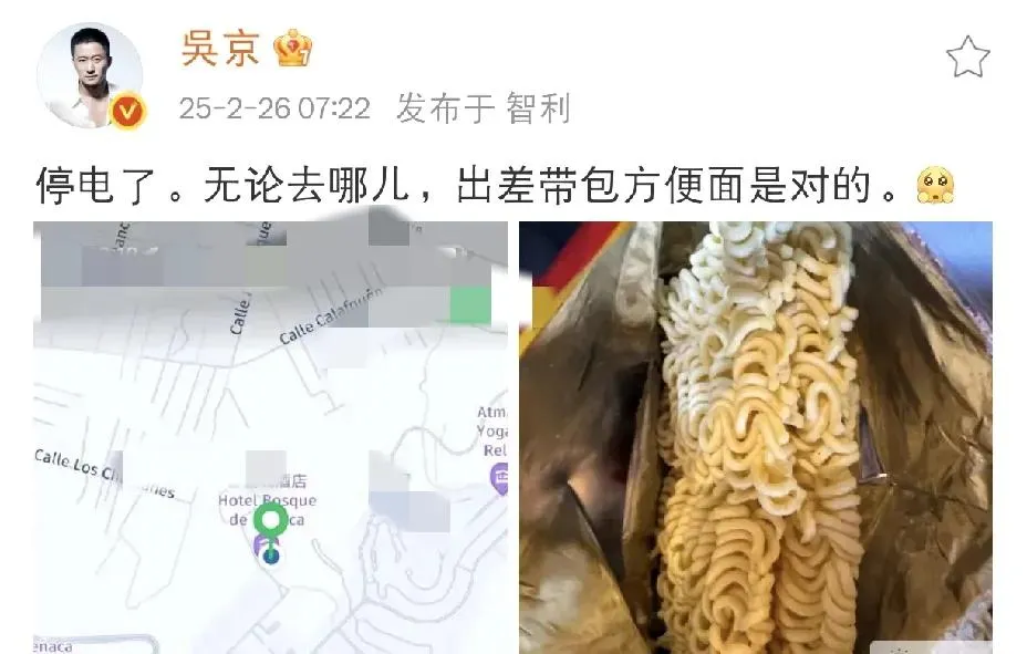 2月26号一大早七点多,吴京在社交平台发了条动态,好家伙,一下子就把网友们的注意力吸引住了。原来,他在智利出差的时候碰上大麻烦啦!当地突然大面积停电,他去的餐厅没办法正常营业,连吃饭都成了大难题。