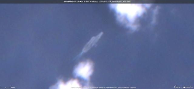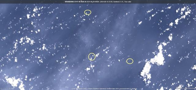 (西方卫星在8月10日拍摄的山东舰航母打击群位于吕宋岛西部海域的照片)