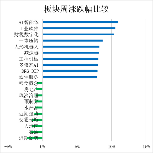 全周盘面上,AI智能体、工业软件、财税数字化、一体压铸、人形机器人、接收器、工程机械、多模态AI、软件服务等板块大涨居前;石油、人造肉、交通设施、水产品、预制菜、风沙治理、房地产、粮食等板块下跌。