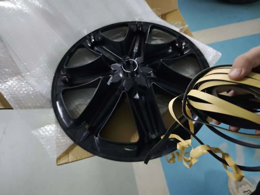 这种第三方轮毂盖都是包边设计,尺寸比原装轮毂盖大一丢丢,所以需要用附赠的软胶沿着外围贴满一圈。