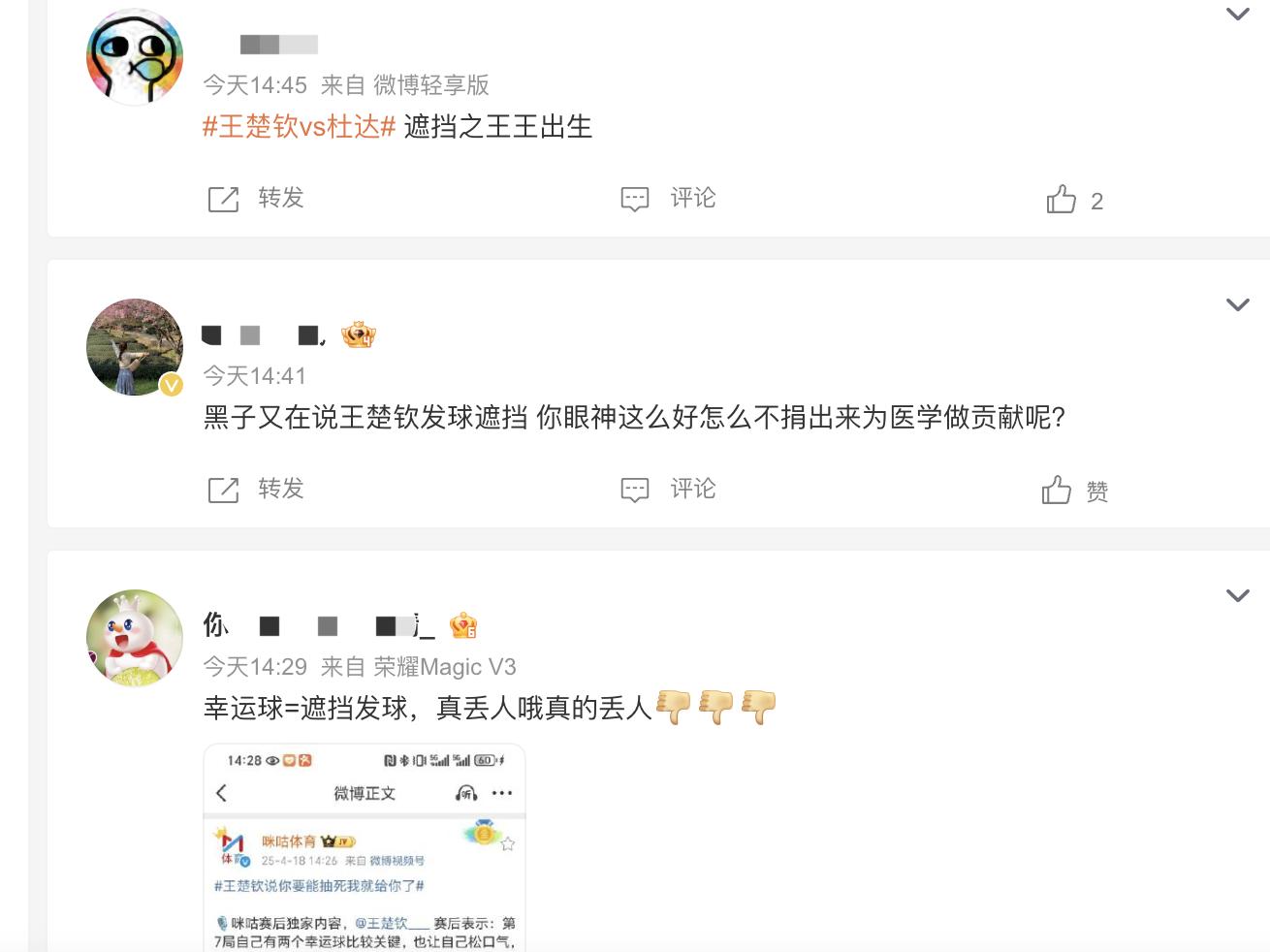赛后王楚钦在接受采访的时候谈到,自己在最后一局有两个幸运球,能够让自己喘一口气也决定了比赛的走势。与此同时,他也关注到对手有些毛躁,他很好的利用了对方的缺点,所以最终拿到了比赛的胜利。结果有些球迷就质疑王楚钦那两个所谓的幸运球存在着遮挡发球的问题,还责怪杜达为什么当时没有要求鹰眼挑战。有球迷声称,即便是杜达挑战不成功,也能够打乱王楚钦的心态,说不定还能够影响比赛的走势。