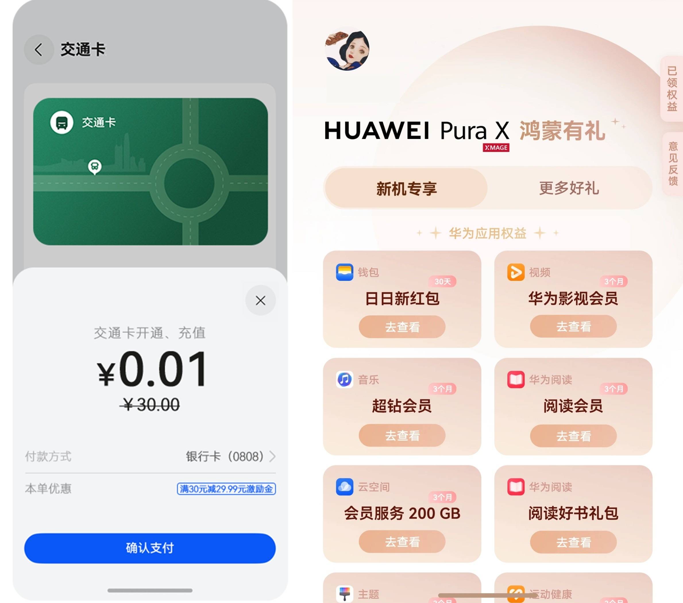 出行方面,华为钱包支持0元开通互联互通交通卡,全国330多个城市乘坐公共交通都畅行无阻,乘车体验更便捷,手机碰一碰闸机即可乘车,遇到紧急无网无电情况下也能用,完美覆盖假期出游和日常出行场景,助你出行无忧。除了公共交通出行,大家还可以通过负一屏的元服务预订火车票、机票,绑定12306或航旅纵横账号后,桌面右滑在负一屏即可直接查看行程信息,实时掌握出行状态。9月30日之前,购入了华为Pura X的用户点击负一屏的“鸿蒙有礼”,还能领取价值1200元+的权益,包含元服务优惠券、交通卡激励金、影音娱乐会员月卡等福利,五一出游在负一屏用同程旅行元服务订车票、机票、酒店,用奈雪点单元服务买饮品等等都能用,大家千万不要错过。