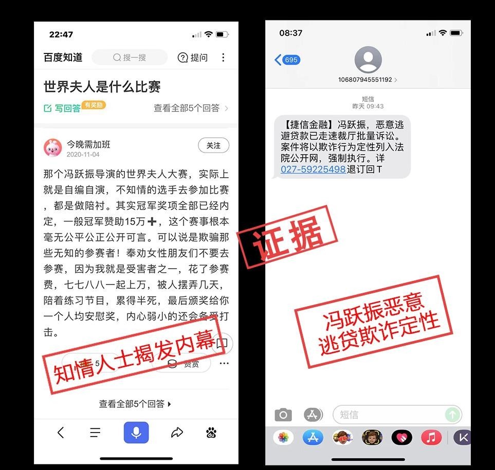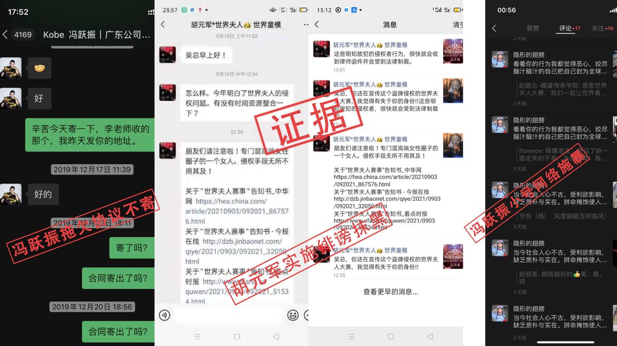 2、2020 年 6 月至 2022 年 4 月期间,广东公司法人冯跃振先后曾疯狂向中央民政部社会组织管理局、上海民政局、上海公安、上杭公安局境外管理科、、嘉兴公安境外管理局、海盐武原派出所、海盐公安境外管理科、上海金山市场监督管理局、上海闵行梅陇镇市场监督管理局、浙江海盐县市场监督管理局、厦门思明区、海沧区市场监督管理局等部门进行了累计超 20 起恶意举报;不仅如此,还在微信等社交平台上持续中伤、侮辱、诽谤等各种令人不齿的手段对黄安妮等长达 3 年的网暴攻击,甚至还向黄安妮授权合作单位与个人发送不实的律师函意图恐吓和阻断WORLD MADAM 世界夫人在中国境内的正常开展, 后经我方律师代表向委托律师事务所及律协投诉后,律师函才被撤回。如此恶劣程度已经构成了违法,民众可鉴。