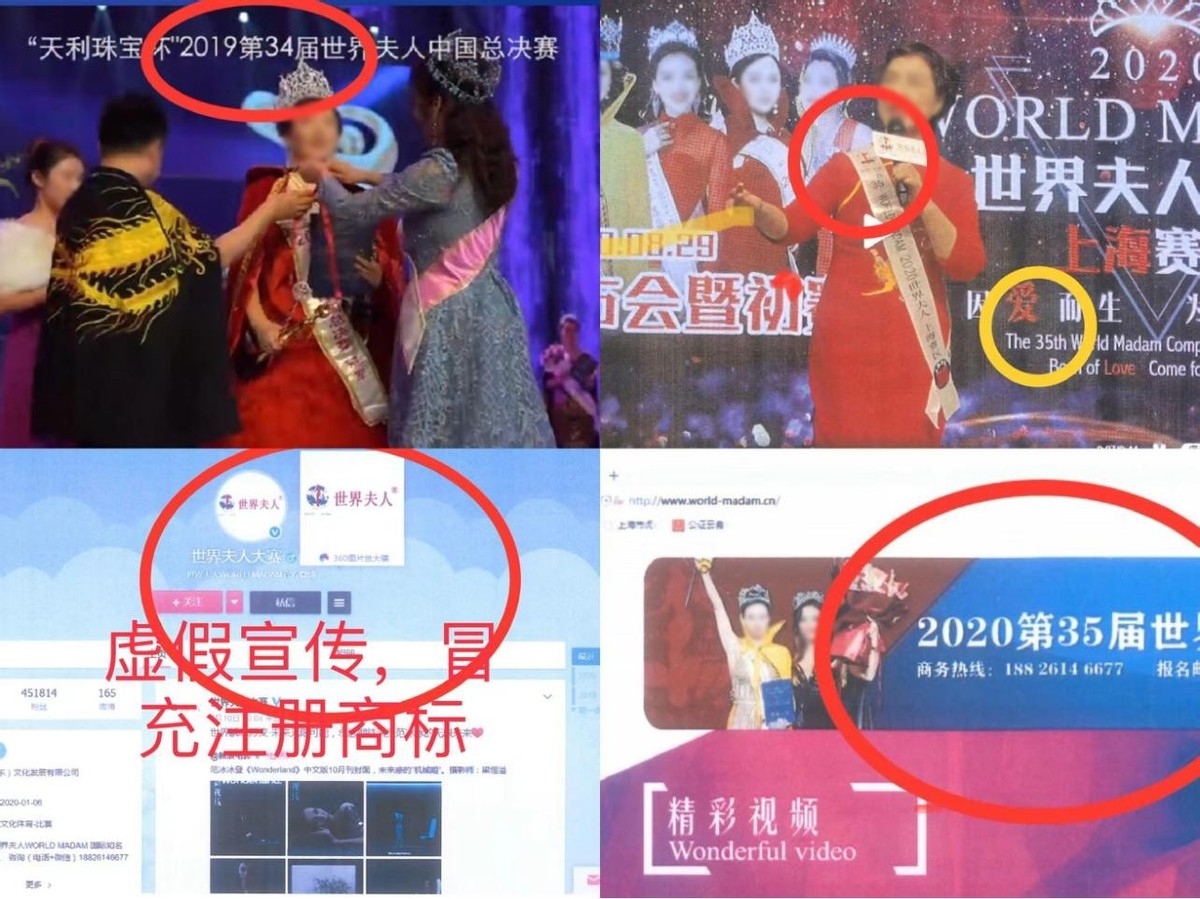 3、特别强调,在第二次开庭法庭上,广东公司代理律师曾当庭承认其虚假宣传行为。事后广东公司不但恼羞成怒,还做出各种疯狂网络攻击,在被法官得知警告下仍利用微信等渠道发送自说自话所谓声明链接等对黄安妮以及中国境内合作单位进行持续抹黑与恶意攻击。此外,广东公司为了急于证明自己, 还欲盖弥彰打着香港公司注册号、甚至在微博等上将“世界夫人”打上“R”来冒充已注册商标,此事曾被工商责令整改,我方已做司法证据保全,广东公司至今仍在掩耳盗铃,散布恶意言论,我方决定将证据提交给中国境内相关执法部门处理。
