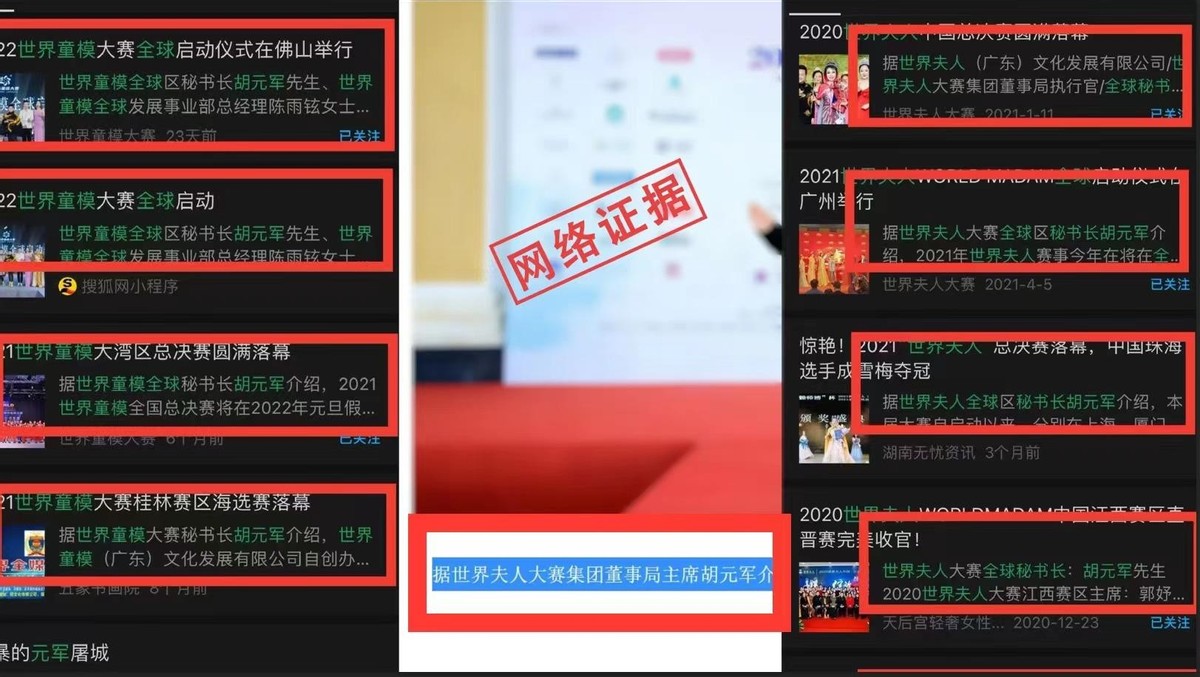 4、就世界夫人集团公司和世界夫人基金会的职能我方在前期声明与新闻发布上均已精准表述过;也早已提报中国境内的有关政务部门。可笑的是,我们关注到广东公司及法定代表人冯跃振和股东胡元军较早时宣称的也是香港注册公司,甚至见我方成立世界夫人集团公司之后,广东公司及法人冯跃振还曾东施效颦地在我方公司名称上加上大赛两字抢注;此外,冯跃振与其股东胡元军经常切换身份身兼多职,比如胡元军先是用香港某公司职务,后自称全球秘书长,然后又宣称某大赛集团董事局主席(可查此公司正是冯跃振香港公司名), 近期又开始开始启用世界童模全球秘书长等;冯跃振与胡元军欲用二人撑起所谓全球组委会却对外宣称都是”世界“级活动,充其量在自娱自乐与自嗨。