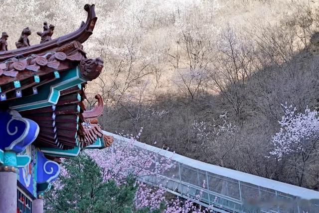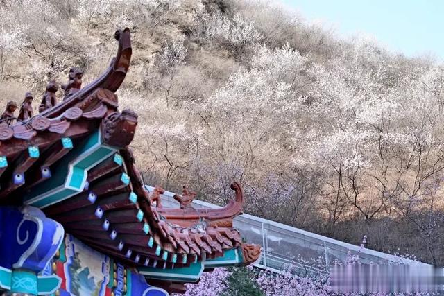 屋顶装饰精美,与山坡上的桃花交相辉映。这样的景色,让人感受到历史与自然的完美融合,仿佛穿越了时空。