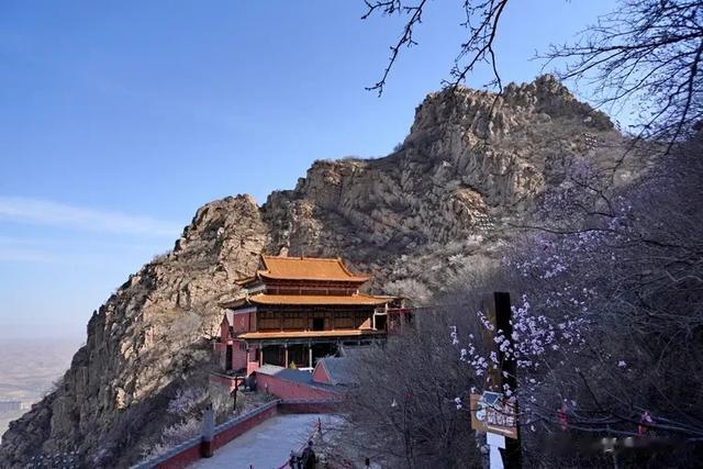 半山腰一座红色庙宇建筑巍然屹立,周围环绕着盛开的桃花树丛。站在这里,俯瞰山下,景色尽收眼底。桃花簇拥着古建筑,仿佛在诉说着岁月的故事。