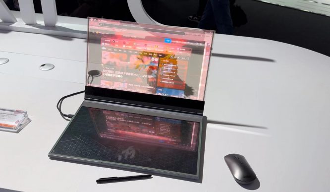 在整个展台上,最吸睛的还属ThinkBook透明版。顾名思义,它的屏幕和A面部分都是完全透明的,而且它所搭载的屏幕亮度能达到1000nits亮度,峰值亮度可达3000nits,可以说是一项难以理解的黑科技技术了。