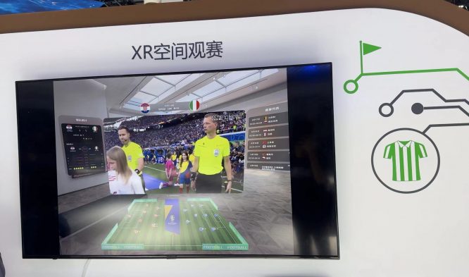 目前欧洲杯激战正酣,中国移动展台也向消费者展示了一波什么是“VIP包厢沉浸式观赛”,消费者通过头戴AR或者VR设备就可以通过可互动3D战术沙盘实时了解比赛数据和首发球员信息等