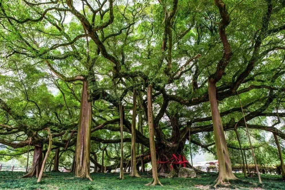 树高70多米,31个根立于地面,林荫覆盖120平方米。郁郁葱葱、高耸挺拔,有着900多年的古榕树,宛若一个老者守护着这片土地,肃穆地迎接着远道而来的客人