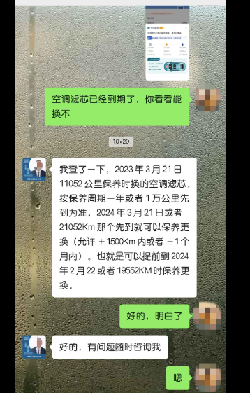 到期保养,但是4s店拒绝保养,app显示空调滤芯,发动机冷却液,燃油滤清器,制动液,火花塞已经该保养更换了,随即联系4s店工作人员,工作人员表示查询后系统显示明年3月才可以保养,现在保养的话只能自费。保养手册规定空调滤芯9个月或者8000公里,先到为准,本人2021年1月购车,车子跑的公里数较少,所以保养走时间先到为准,2年时间更换发动机冷却液,燃油滤清器等,现在差1个月两年,app显示已经该更换了,今年3月更换机油机滤空调滤芯,到现在正好该换空调滤芯。4s店里说以系统显示为准,我想问问大家有遇到过这种情况吗?已经打过400,等待回复。