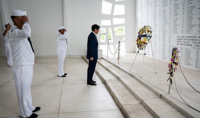 (小马科斯向二战日本偷袭珍珠港事件的阵亡者献花圈)