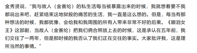 金秀贤说2024年,金赛纶在网络上晒出两人合照时,他否认两人曾经交往过的事实,是为了当时的《眼泪女王》考虑。