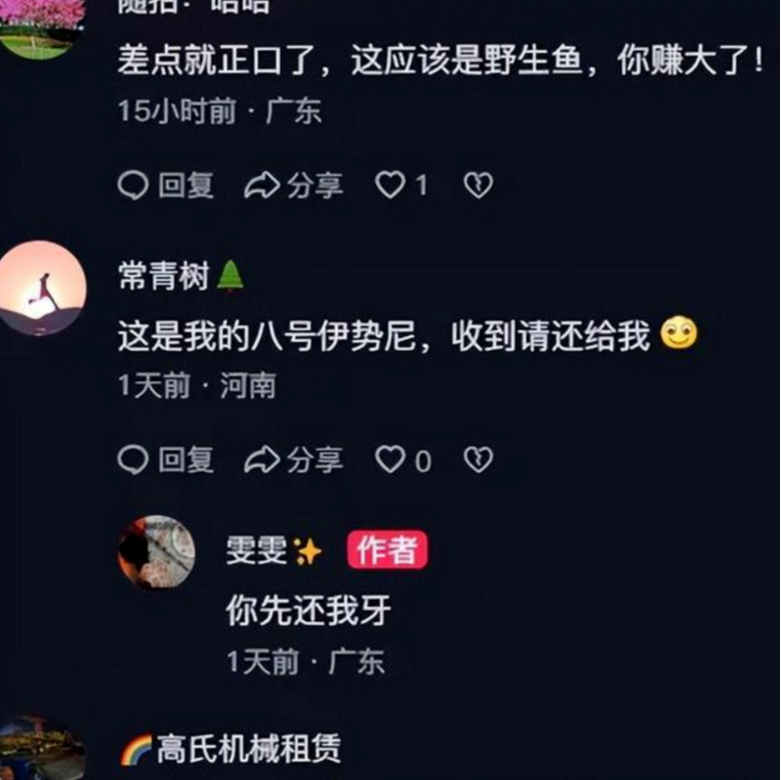 尽管这起事件让女子心有余悸,但网友们却并不这么认为。很多网友在她的分享中,打趣道:“差点就正口了,这应该是野生鱼,真是赚大了!”甚至有网友调侃:“这是我的八号伊势尼,收到请还给我。”这番调侃让吃鱼的女子哭笑不得,回复道:“你先还我牙。”