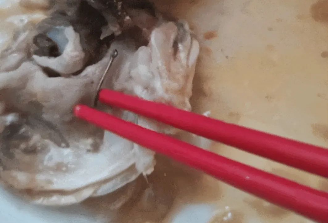 她把鱼处理好,放入锅中烹饪,香味四溢。正当她愉快地品尝着这道美味时,突然在鱼头部发现一块闪亮的物体。她好奇地用筷子拨弄了几下,结果惊愕地发现,这条鱼的头部竟然暗藏一枚锋利的鱼钩!如果不小心咬到,牙齿可能会被崩掉,更严重的是,如果这枚鱼钩被吞进肚子里,后果不堪设想。