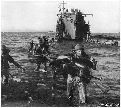 在五分钟左右的时间内,美军驱逐舰就发射出了1 176发5英寸炮弹。一发盟军的五英寸炮弹,起步价可是24公斤,也就是说这四艘军舰在很短时间内就发射了28吨左右的炮弹。二战时期,德军、苏军步兵师一次火力齐射,可都只能发射一吨出头的炮弹。美军四艘驱逐舰等于在很短时间发射的火力,就相当于20来个德军步兵师,直接把德军精锐打得怀疑人生。