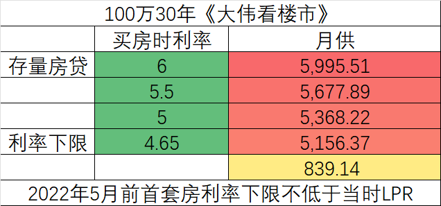 简单计算,大部分存量房贷发生时最低下限是4.65,购房者基本是按照6左右购房,也就是100万30年,可以月供从5995元每月降低到5156元左右,下调840元左右。(注:北京等大城市因为加点没有明显调整,所以没有影响。)