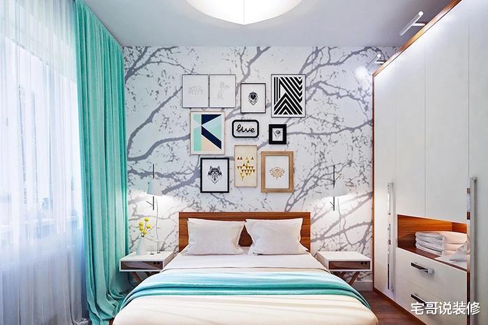 为了能方便的进出卧室,卧室和客厅中间在电视墙的两边设计了两个入口。卧室虽然面积进行了缩减,但是也不会感到压抑。整体风格还是延续的是现代生态风格,几种颜色的碰撞,不会让室内感到杂乱,反而觉得很清爽。
