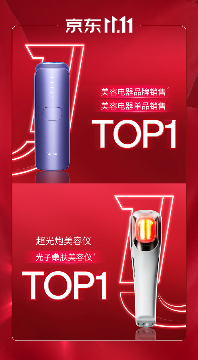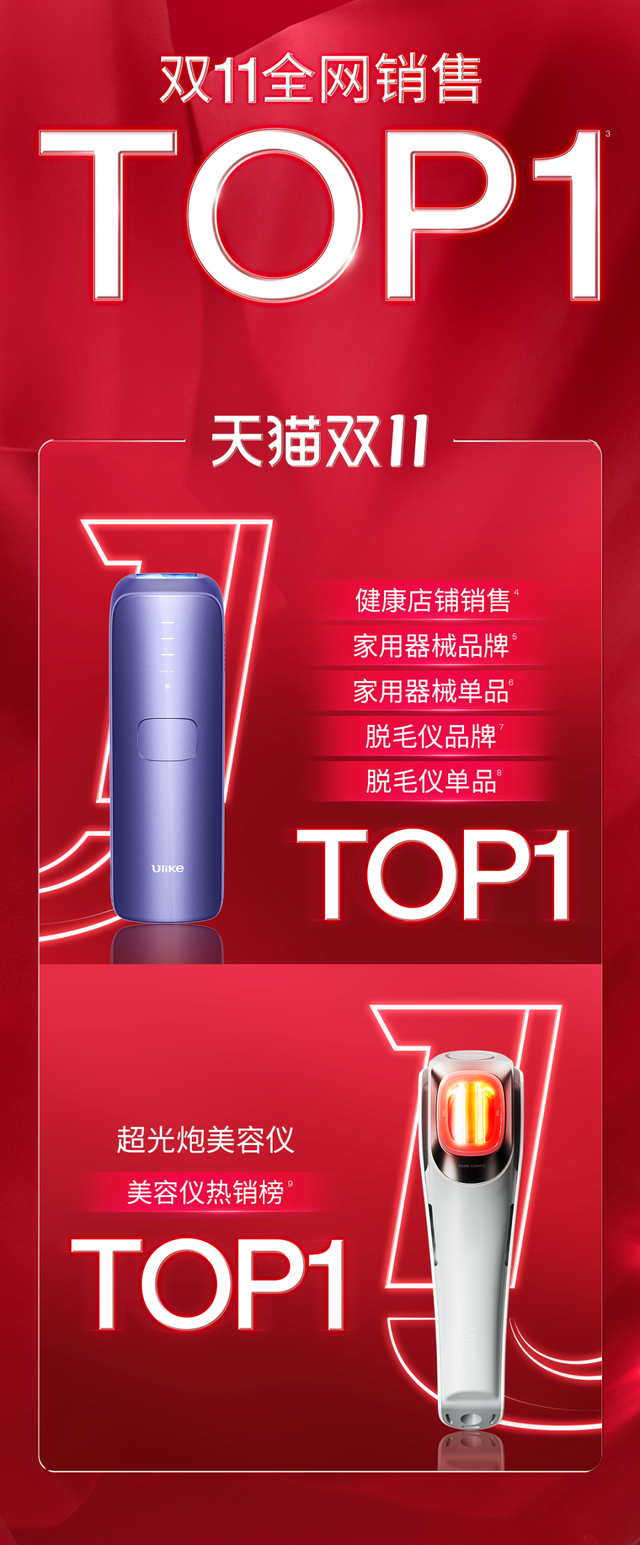 Ulike斩获“健康店铺销售榜、家用器械品牌榜、家用器械单品榜、脱毛仪品牌榜、脱毛仪单品榜、美容仪热销榜”6大榜单销售第1。