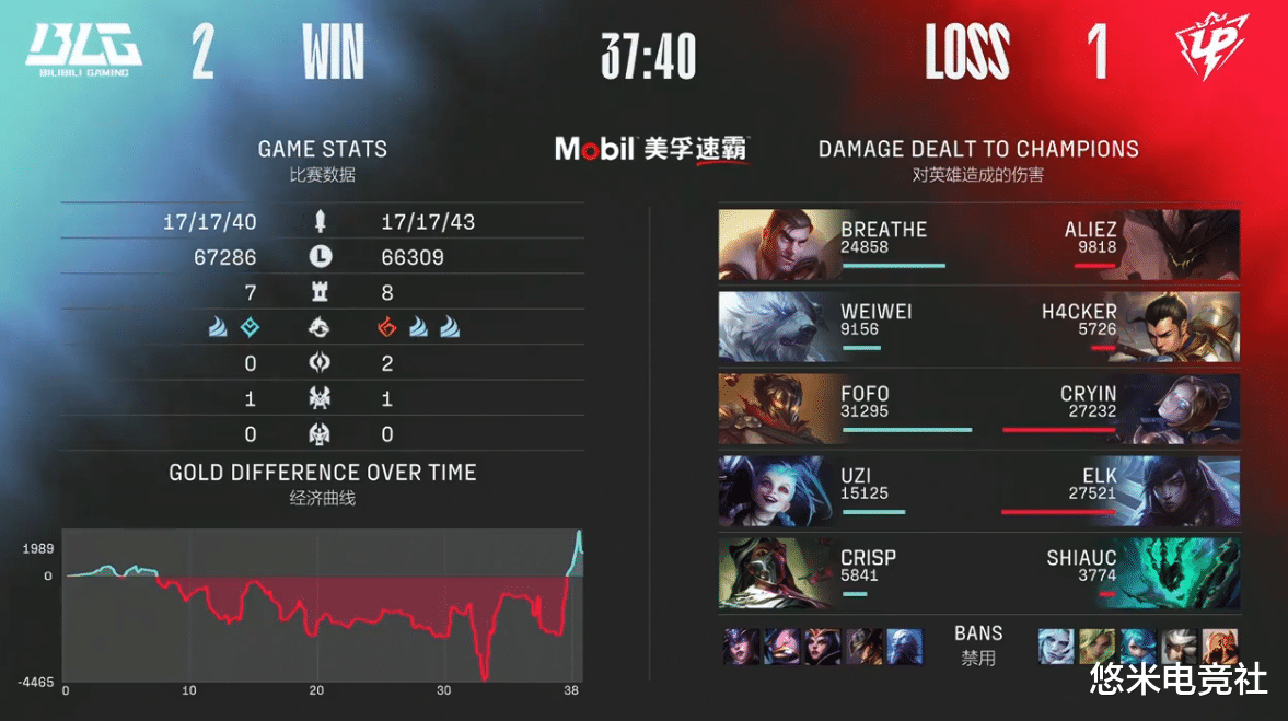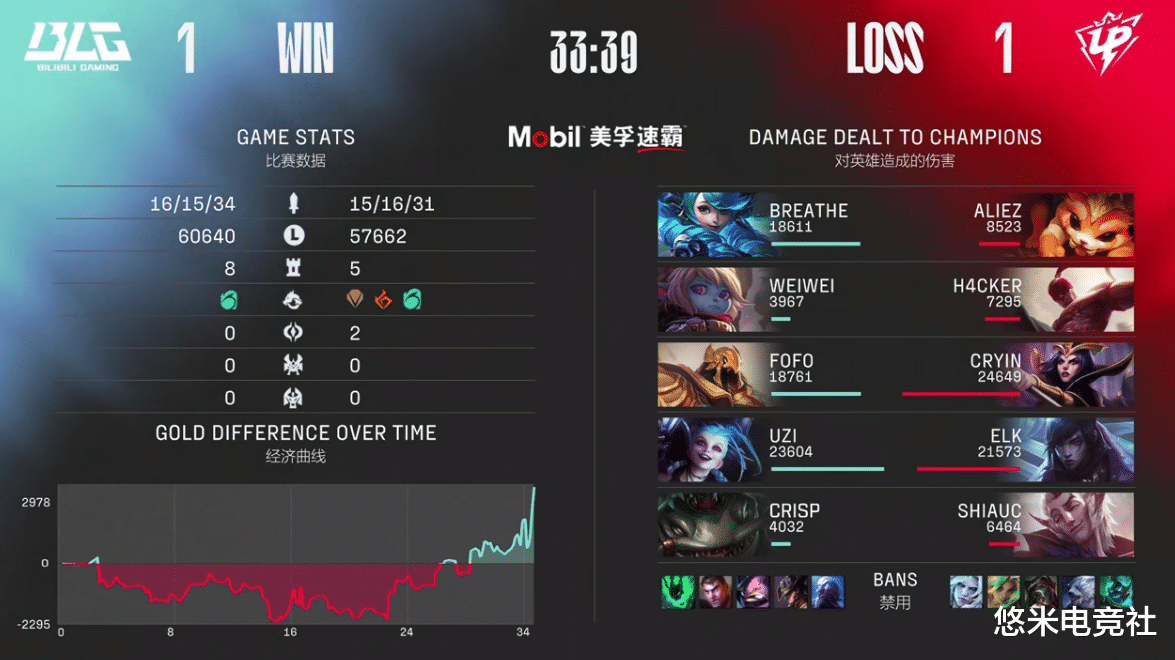 不过BLG依旧占据优势,在29分钟的龙魂团中,Breath进场砍下双杀,BLG打出二换四后拿下水龙会魂。随后双方对大龙展开争夺,尽管Breath先行秒杀了Cryin,但还是让Hacker进场抢下大龙,Elk完成收割。整顿一波后,双方在小龙处落位,UP成功拿下远古巨龙并打赢团战,顺势一波拆掉BLG主堡,拿下首局!