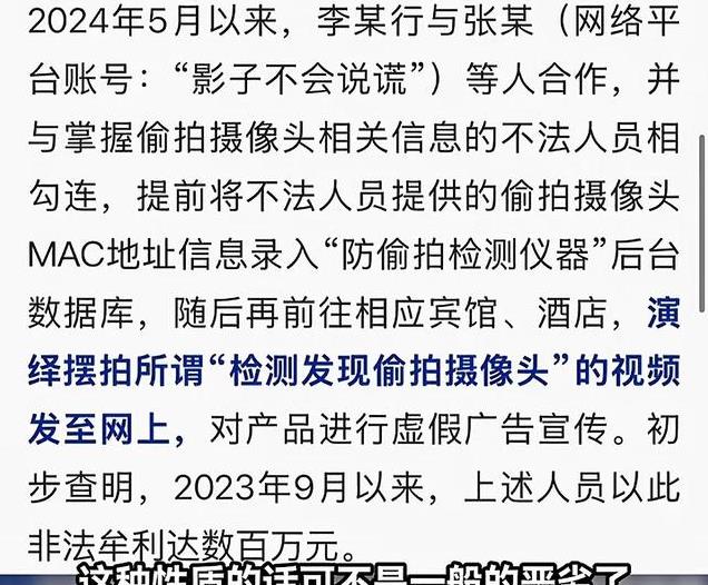 另一方面,网上曝出了一位网红自导自演戏码,私自在酒店等场所安装摄像头,然后再去这些地方,用自己宣传的伪劣摄像头检测仪去做检测,来获取利益。目前该网红的账号已经封禁,并且也付出了应有的代价。