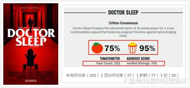 烂番茄上,102位影评人给出了75%的新鲜度,其中77个新鲜,25个烂,但观众的爆米花指数则高达95%。1980年的《闪灵》,烂番茄斩获了85%的新鲜度和93%的爆米花指数,对比来说,《睡梦医生》原创故事新鲜度方面有所下降,但观众的爆米花指数却和前作持平并略高一些。