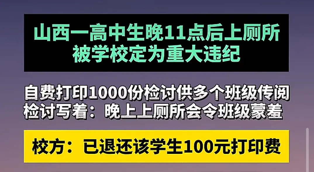 此事件迅速在网络上发酵,舆论场上一片哗然。有网友说,夜间上厕所本是人之常情,怎能因此被冠以“重大违纪”之名?更何况,要求学生自费打印千份检讨,不仅经济负担沉重,更在心理上造成了巨大压力。还有网友说:“学生上个学是不是还得穿个纸尿裤。”