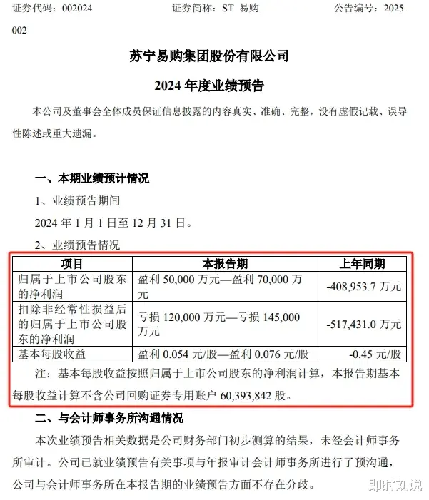 日前,苏宁易购发布的2024年度业绩预告显示,其实现归属于上市公司股东的净利润为5亿元至7亿元,相比上年同期的-40.9亿元,成功实现了扭亏为盈。