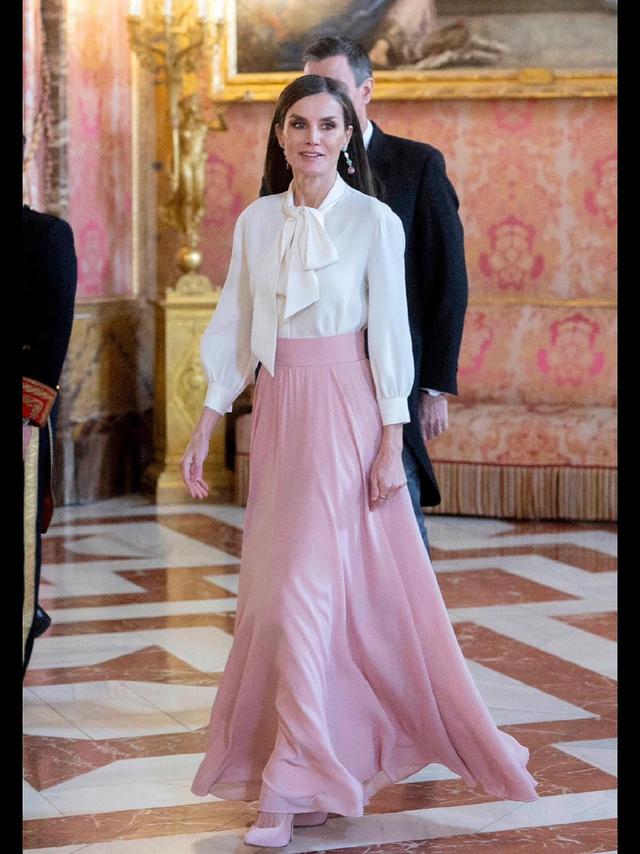 谁说51岁的女人就不能穿粉色呢?西班牙王后也将粉色的半身裙也用在这身白色衬衫的造型当中,不但没有扮嫩的迹象,反而会觉得气质清新脱俗。