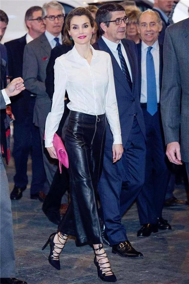 看西班牙王后用白色衬衫搭配黑色的九分皮裤,体现出了女王范儿,脚下的这双绑带高跟鞋更是这身造型的点睛之笔,不仅有利于增高,而且也增加了性感迷人的气质。