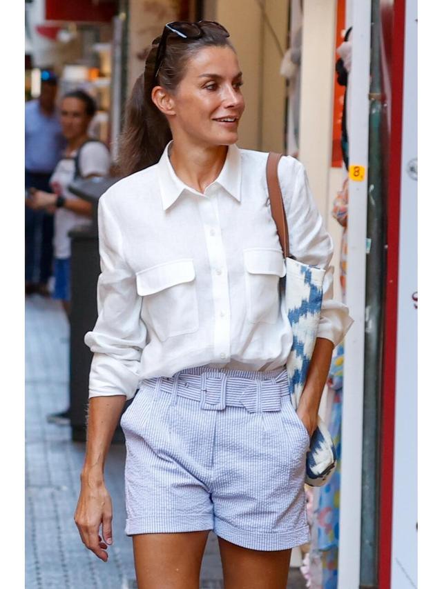 随着气温越来越热,大家也可以将长裙或长裤换成短裤的搭配,这样会显得更清爽。西班牙王后穿上蓝色的格纹短裤,更展现了清新脱俗的魅力,衬衫塞进裤子中更显得腰细。