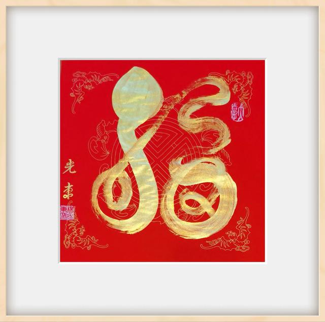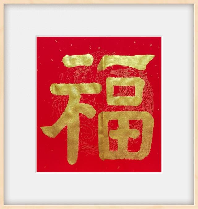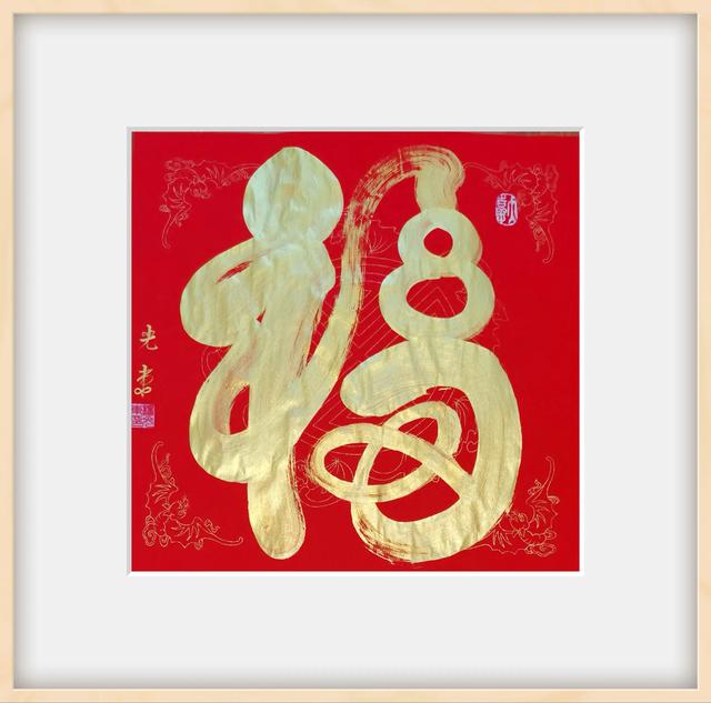 国潮福字用金墨书写在五福临门福字斗方上,金墨点睛。黄为土,红为火,五行相生则吉。加持吉祥,加持富贵。