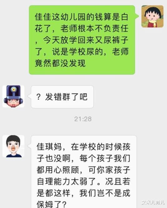 有眼尖的家长发现发错群后,发了一条信息提醒,老师看到信息后明显很不满意,在群里回复佳佳妈:孩子在学校也没有尿裤啊,每个孩子我们都用心照顾,可你家孩子自理能力太弱了,如果孩子都这样,我们岂不是成了保姆了?