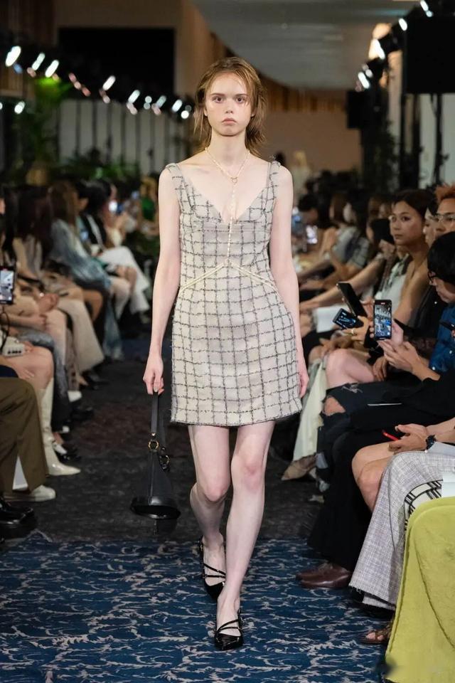 ▲ 色彩与材质的完美结合_在色彩的选择上,设计师以米色和灰白色为主调,这些接近肌肤的色彩营造出一种温暖而怀旧的氛围。与之相辅相成的亮片与珍珠装饰,犹如夜空中闪烁的星辰,点缀其间,为整个系列增添了一份梦幻般的光泽。这种色彩与材质的结合,不仅展现了设计的匠心独运,更引发了观众对春夏季节的美好向往。