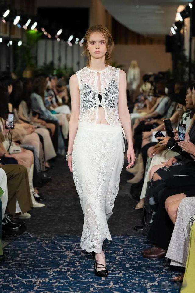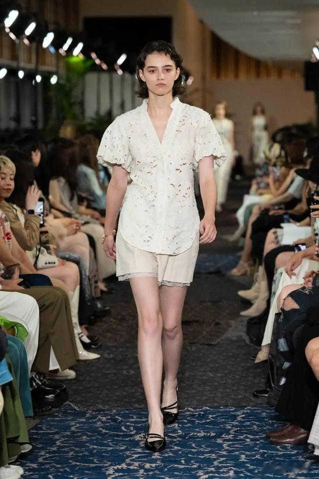 ▲ 设计理念与情感表达_这一系列的核心在于设计师对情感的深刻理解与诠释。开领衬衫与短裤套装以坚韧的蕾丝面料为基础,营造出浪漫而轻盈的氛围,仿佛初春的花瓣随风舞动。与之相对的,是珍珠装饰的“水手领”项链,冷峻而又优雅,为整体造型增添了一抹光辉。设计师独特的镂空技巧,让肌肤的美感在细腻的蕾丝中若隐若现,展现出女性魅力的独特韵味。