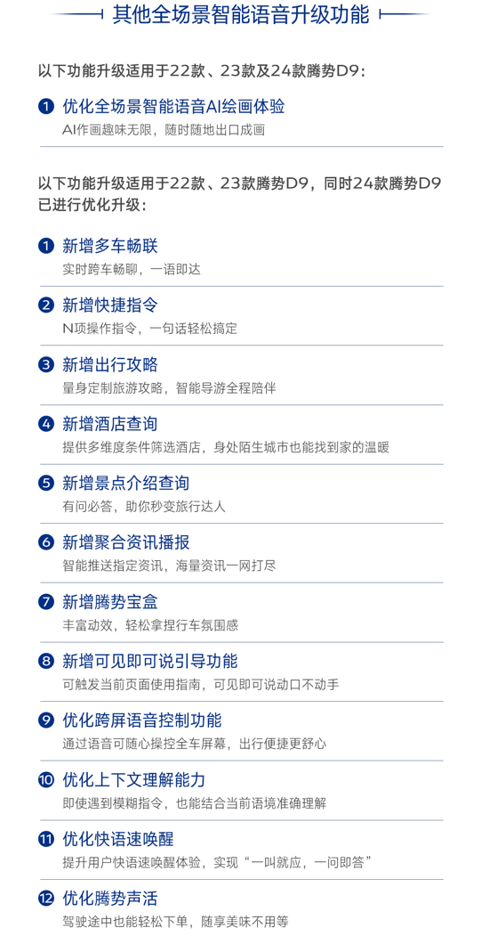 新增高德地图红绿灯倒计时和绿波车速功能;新增全场景智能语音智慧问答、多车畅联、快捷指令、出行攻略、酒店查询、景点介绍、聚合资讯播报、可见即可说引导、腾势宝盒功能;新增移动数据关闭的弹窗提醒;新增开通手机NFC车钥匙语音引导;优化全场景智能语音系统、跨屏语音控制、上下文理解、快语速唤醒、腾势声活功能;优化高德地图导航信息显示样式与布局;优化车机卡片显示,进入应用时桌面卡片收起,调整音源卡片形状;优化手机无线充电提示功能,仅在状态栏显示充电状态;优化多人操作场景滑门开启响应策略;优化滑行回馈功能,提升用户体验。