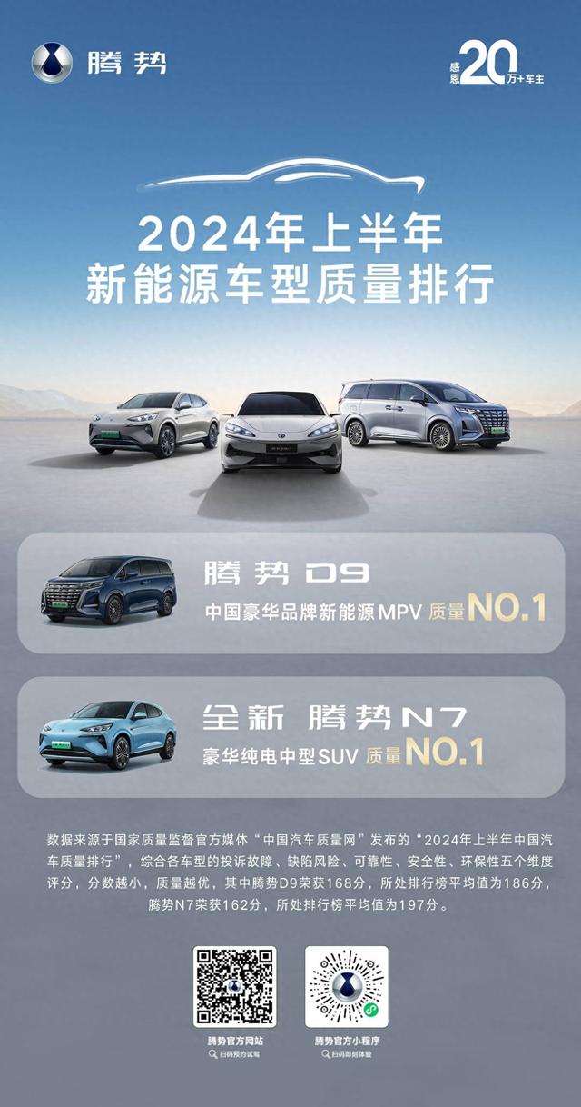 现在的消费者买车往往都很看重车的质量如何,尤其是豪华MPV,家庭出行对车的质量和智能化尤为看重。在2024年上半年新能源车型质量排行榜中,腾势D9以其卓越的产品品质和可靠的性能表现,荣获中国豪华品牌新能源MPV质量第一名。这一成绩不仅印证了腾势D9在新能源MPV市场的领导地位,更是对中国品牌在新能源汽车领域持续进步的认可。腾势D9在新能源中型及中大型MPV榜单中名列前茅,其成绩远超同级别其他品牌车型。这一成绩的取得,得益于腾势D9在设计之初便秉持的高标准、严要求。从车身结构到内饰材质,再到动力系统与智能配置,每一个细节都经过精心打磨,确保每一辆车都能达到最高标准。